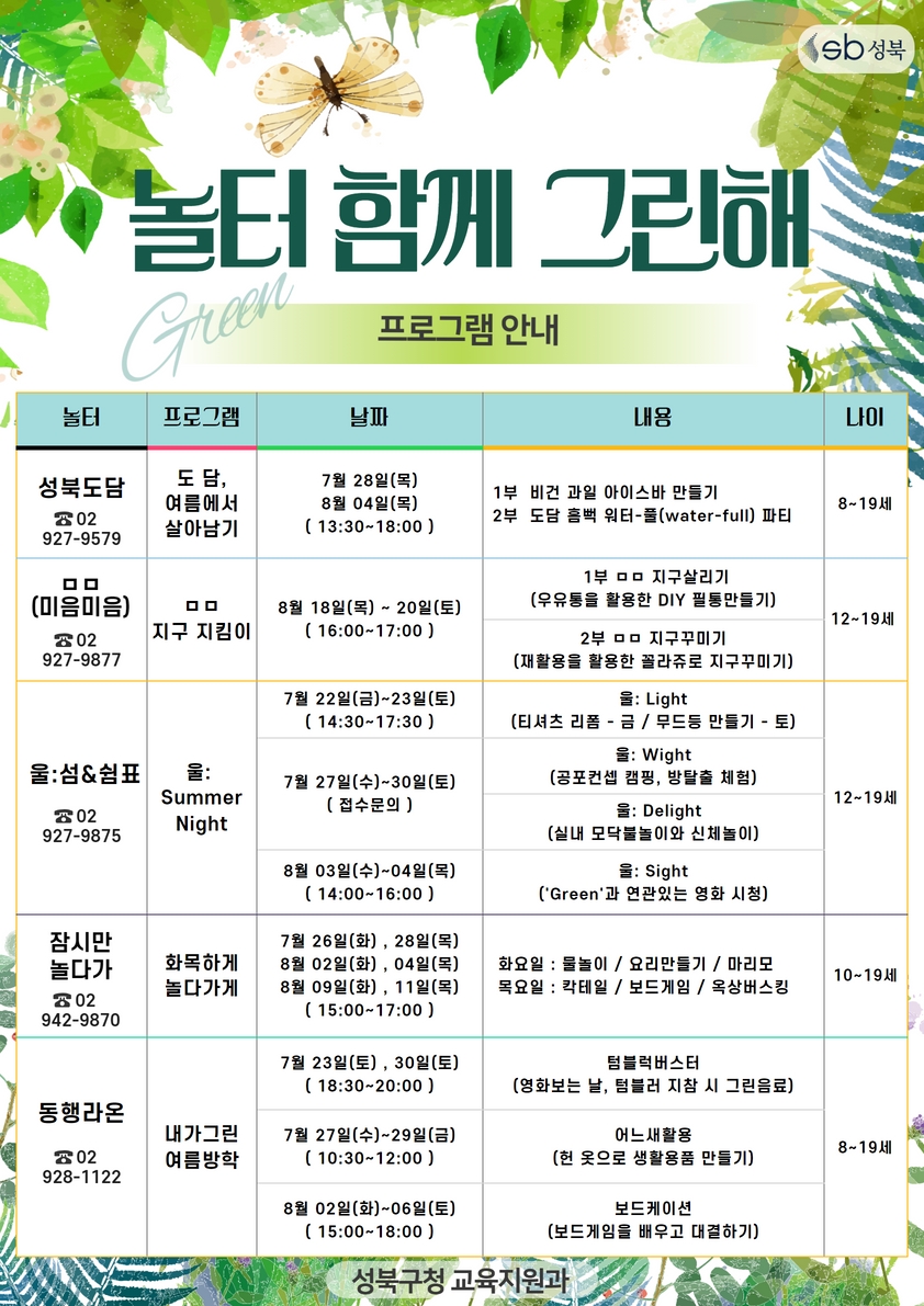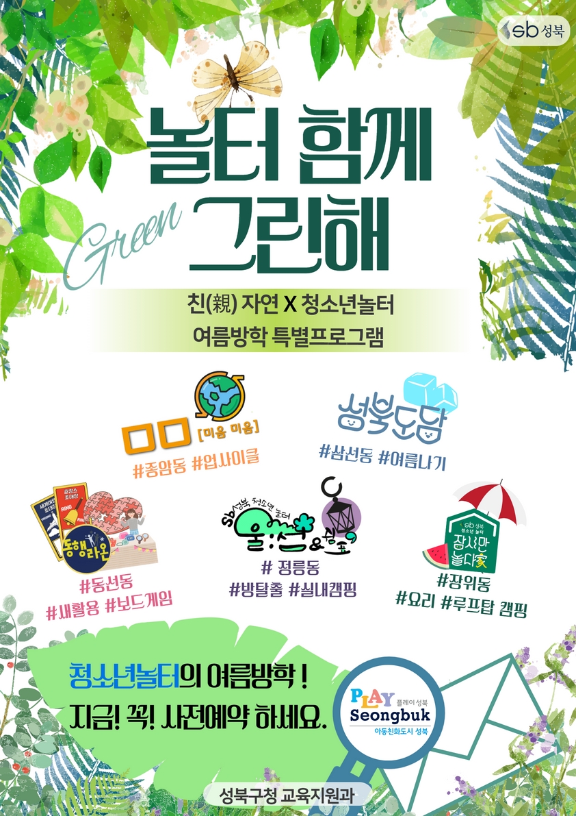 22년 성북구의 여름을 그린으로 그려나간 청소년놀터! 청소년놀터가 그린 그린은 과연? 소개합니다! 포스터의 내용과 놀터의 사진을 보며 어떤 놀터의 행사 모습인지 상상해보세요,