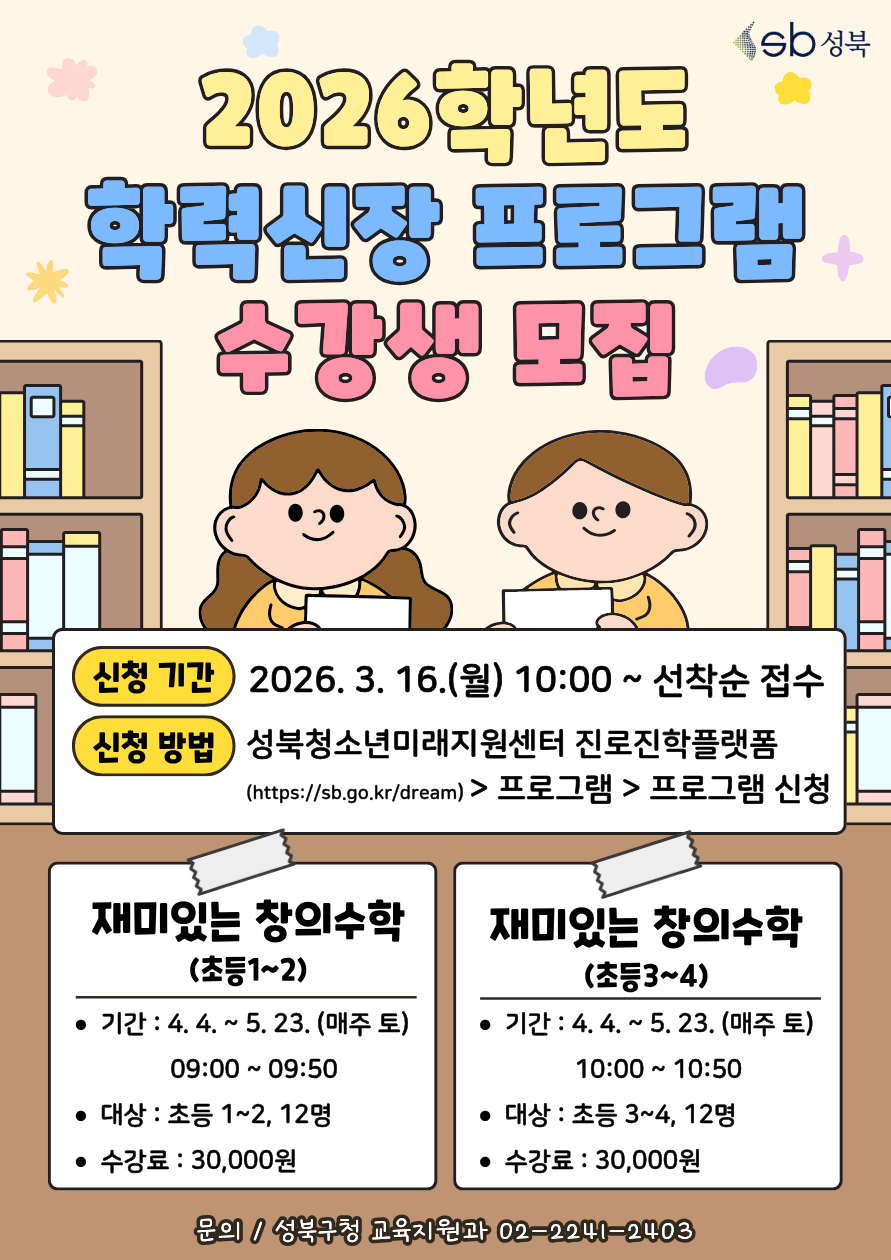 ■ 모집 게시일(26.3.9.)현재, 성북구에 주소가 등재되어 있거나 성북구 소재 초등학교에 다니는 학생만 신청 가능