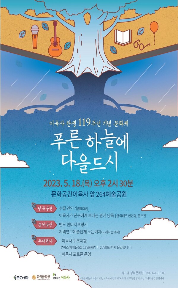 성북구(구청장 이승로)는 성북문화원(원장 김영일)과 함께 18일 이육사 탄생 119주년 기념 문화제 ‘푸른 하늘에 다을드시’를 개최한다. ‘문화공간 이육사’와 ‘이육사 예술공원’이 무대로 행사가 펼쳐져 이육사의 삶과 작품을 더욱 뜻깊게 체험할 수 있다.