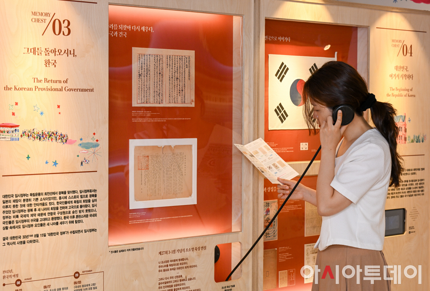 27일 서울 성북구 문화공간이육사에서 열린 '대한민국 임시정부 기억상자' 기획전시를 찾은 시민이 독립운동가 조소앙 선생의 3.1운동 기념식 육성 연설을 듣고 있다. 광복 80주년을 맞아 문화공간이육사-국립대한민국임시정부기념관이 공동 주최한 이번 기획전은 임시정부가 광복을 거쳐 대한민국 정부로 계승되기까지 펼친 역사를 소개한다. 특히 대한민국 임시정부에서 활동한 성북구와 관련한 독립운동가들을 전시로 만나볼 수 있다. /정재훈 기자