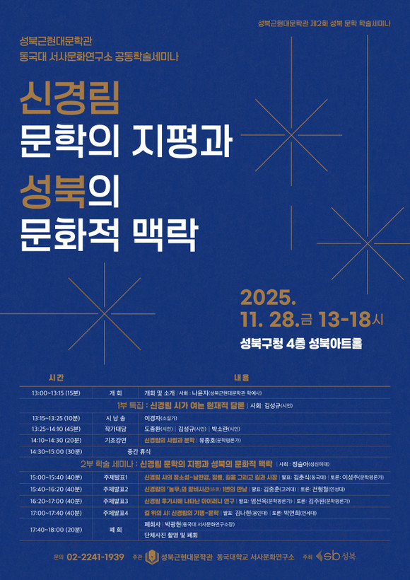 동국대학교(총장 윤재웅) 서사문화연구소와 성북근현대문학관이 공동 주관한 신경림 시인 추모 문학 학술 세미나 “신경림 문학의 지평과 성북의 문화적 맥락”이 지난달 28일 성북 아트홀에서 성황리에 개최됐다.