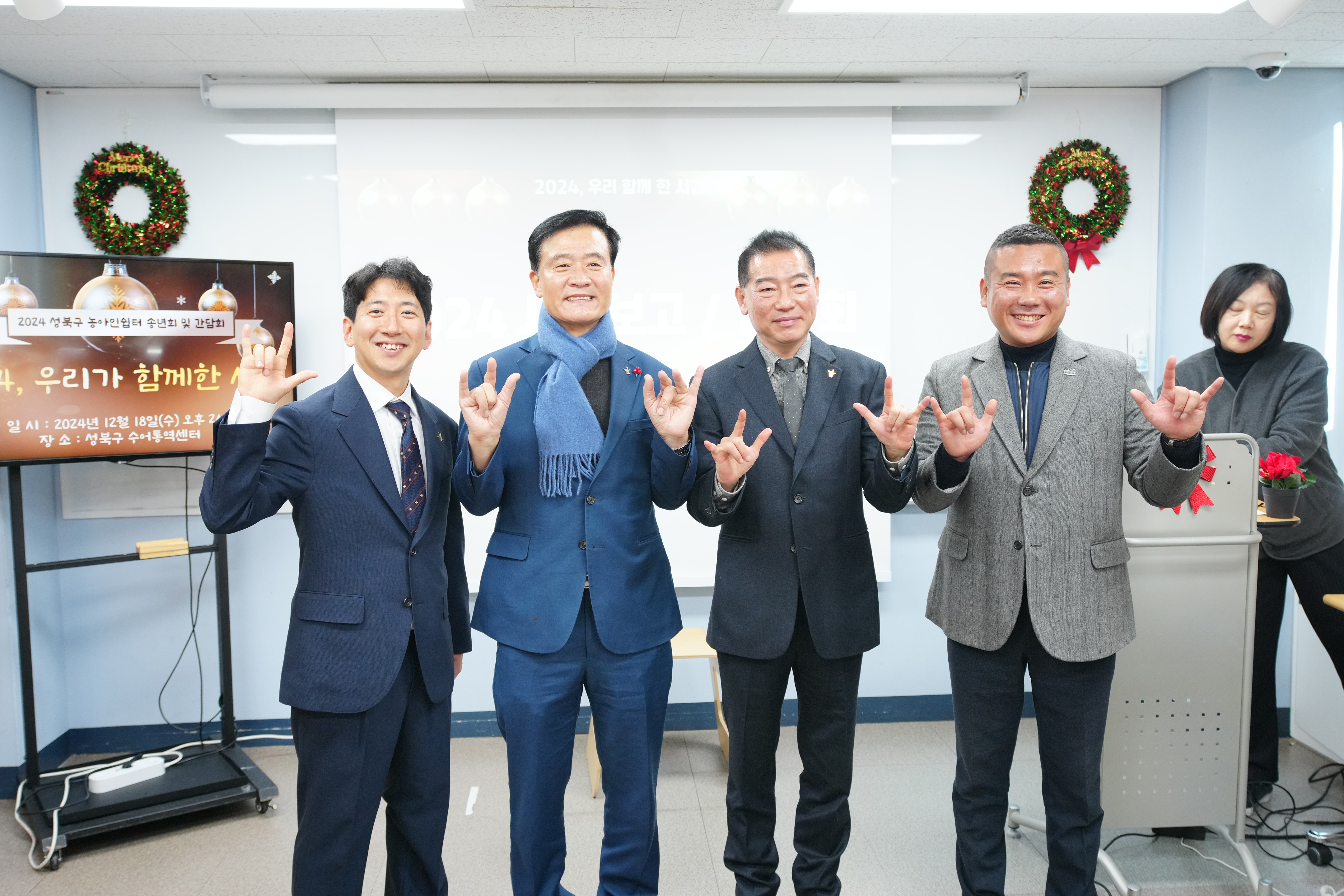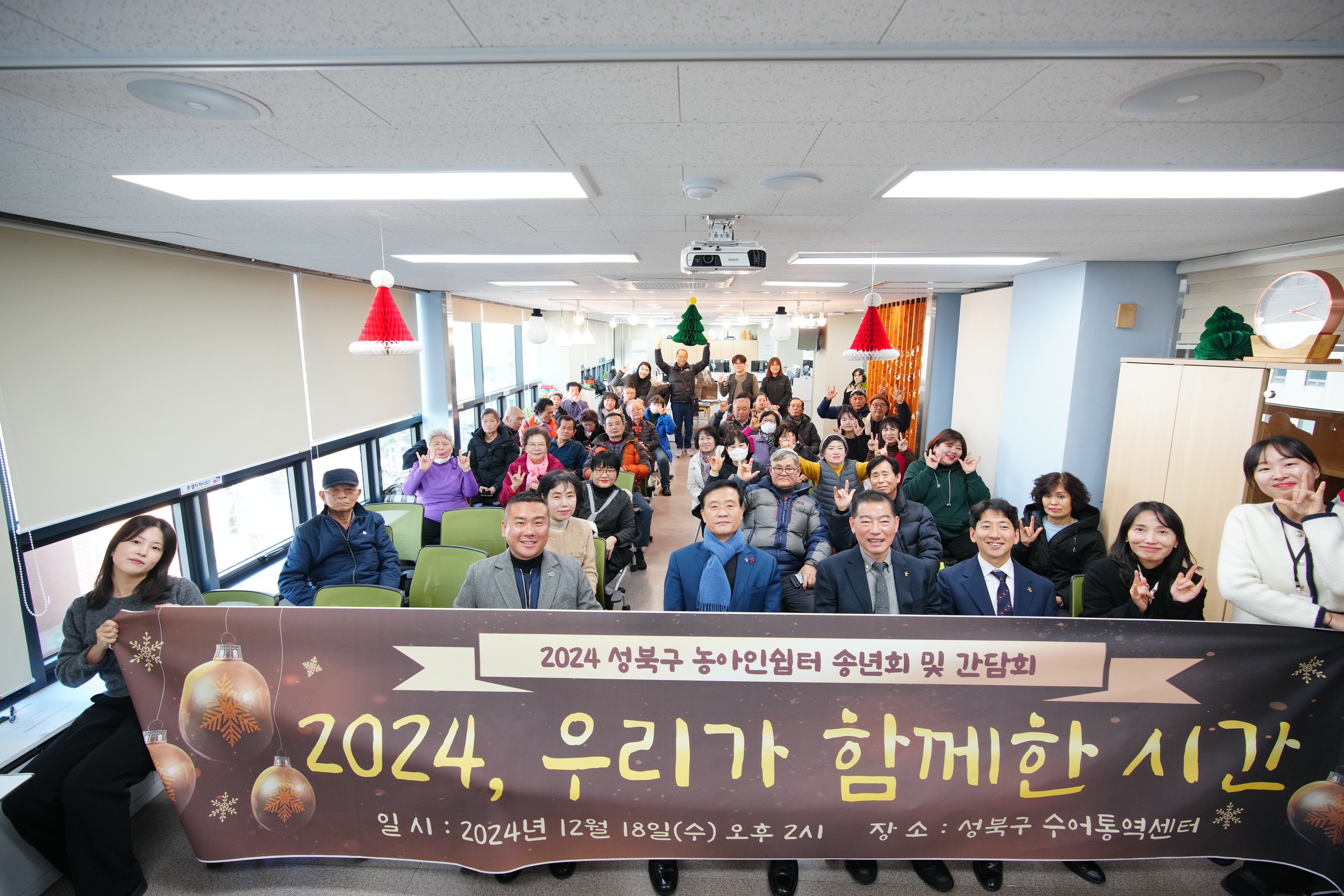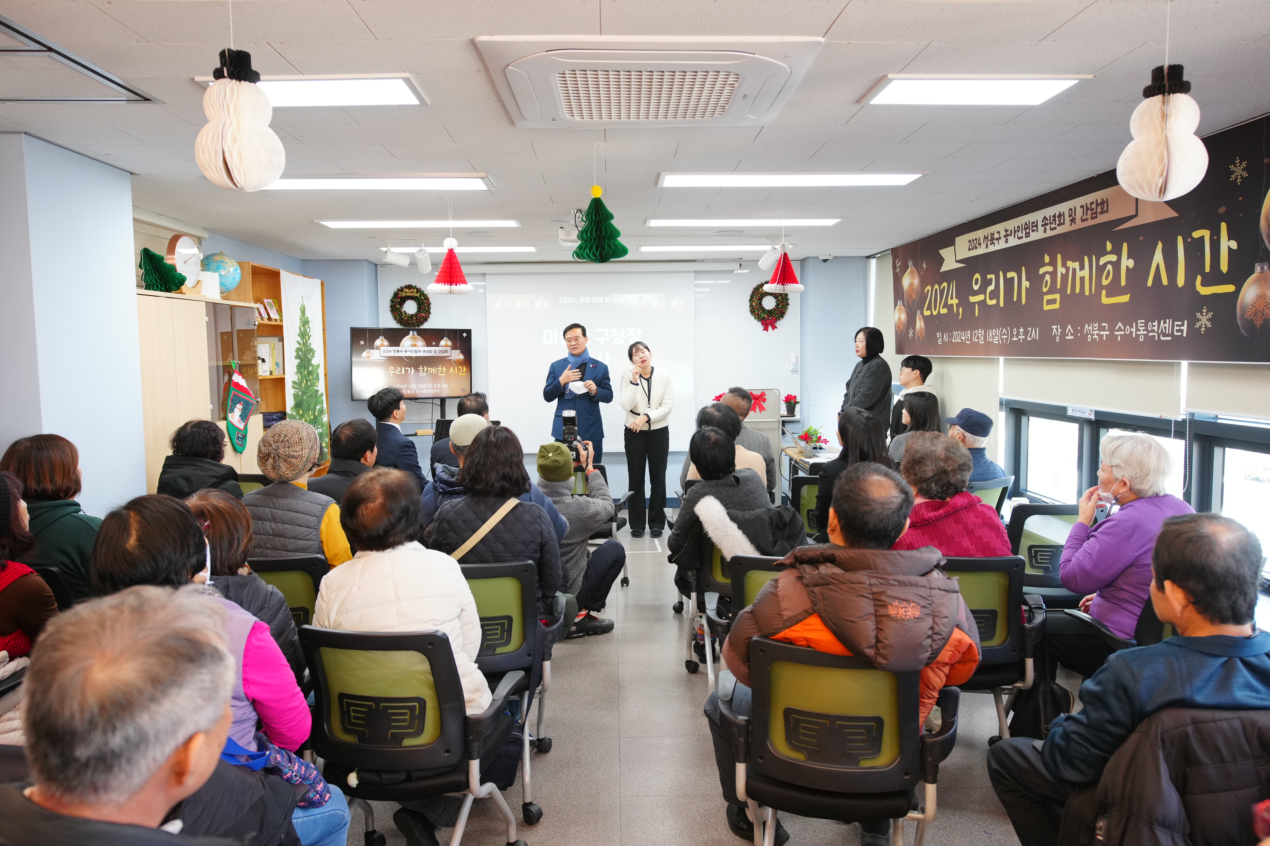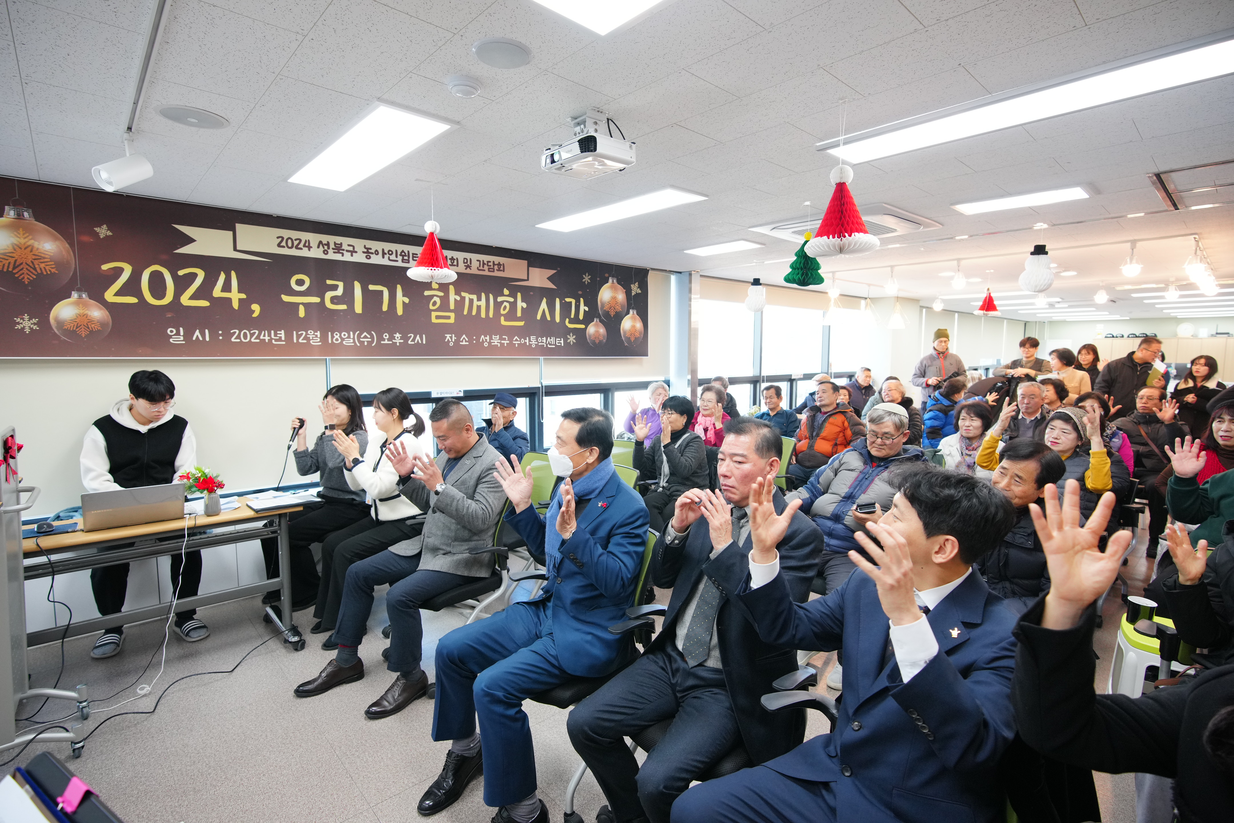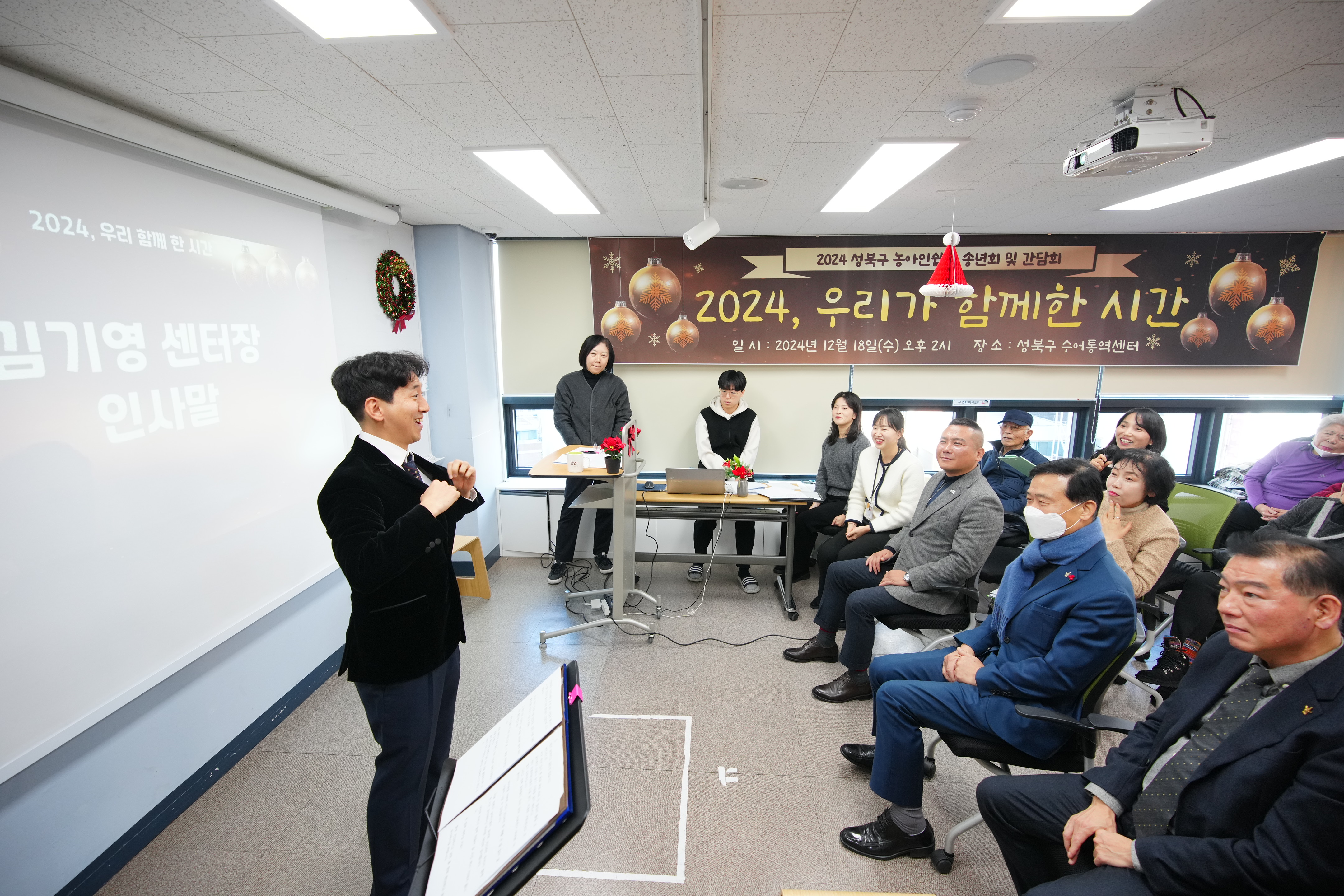 포토, 현장속으로 홈 구청장은 지금 이승로입니다 공약&매니페스토 참여와 소통 구청장은 지금 현장 구청장실 포토, 현장속으로 포토, 현장속으로 영상으로 보는 구정활동 언론이 보는 구정활동 공유하기 블로그 페이스북 닫기 인쇄 복사 성북구 농아인쉼터 송년회 및 간담회 {게시글 제목} - 사진번호, 촬영일, 촬영자, 촬영장소, 출처, 분류, 설명 정보 제공 사진번호 20636 촬영일 2024-12-18 촬영자 홍정모 촬영장소 성북구수어통역센터 출처 홍보전산과 분류 ▶복지교육국>어르신·장애인복지과 설명 성북구 농아인쉼터 송년회 및 간담회 이전으로 다음으로 목록보기 다운로드 이전 다음 닫기 다운로드