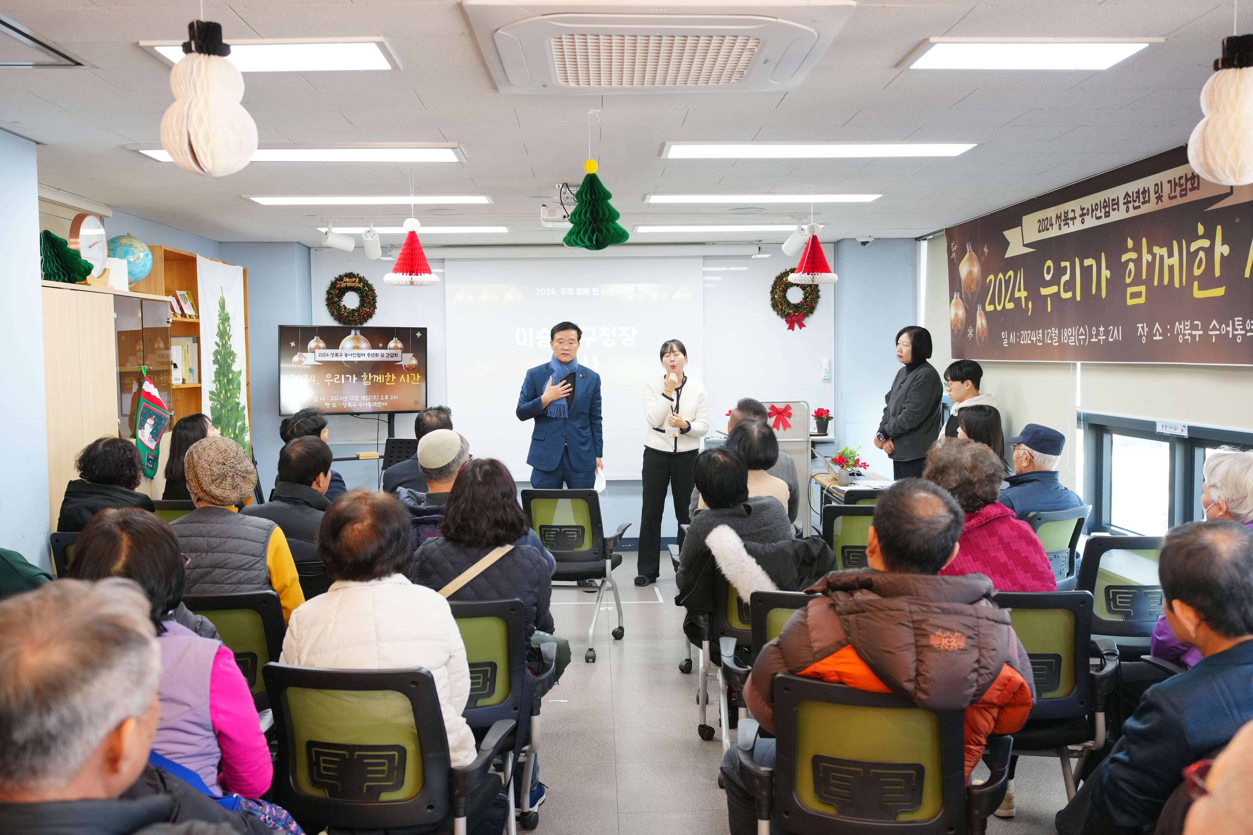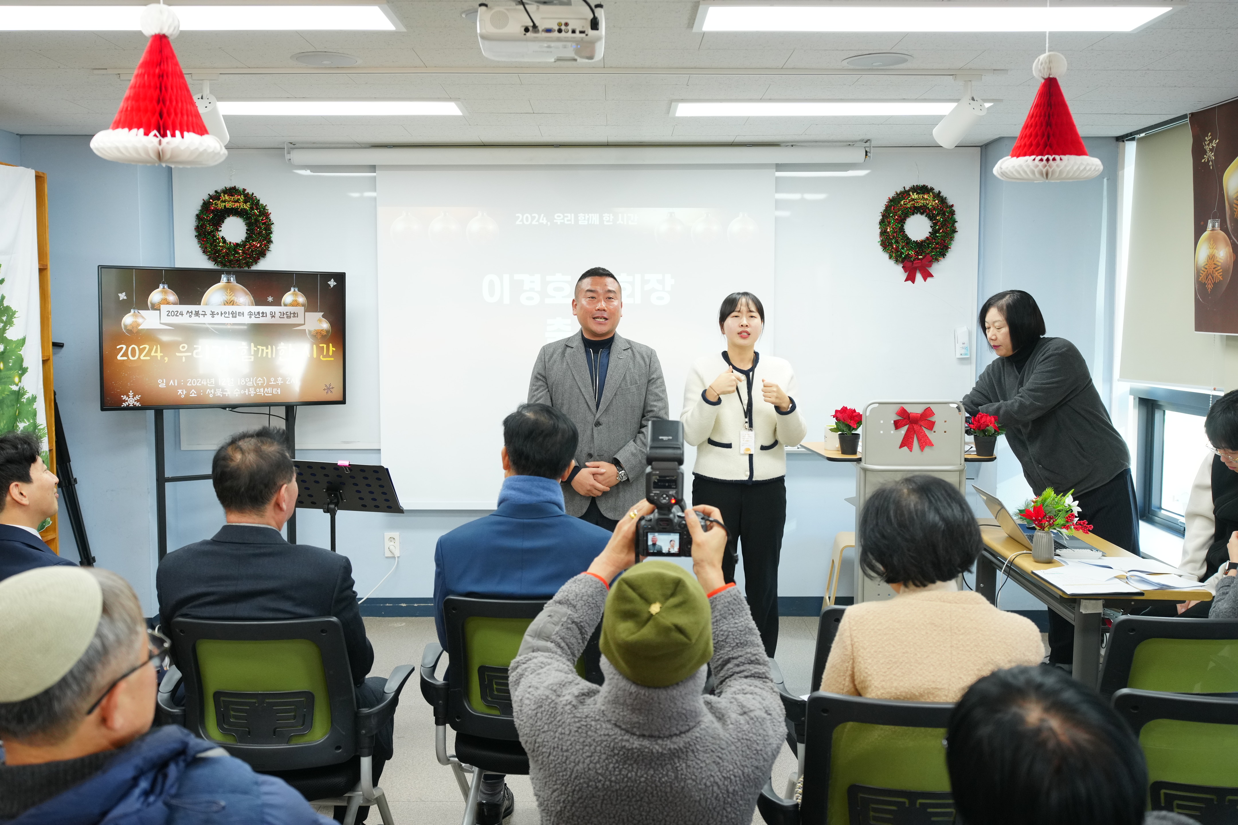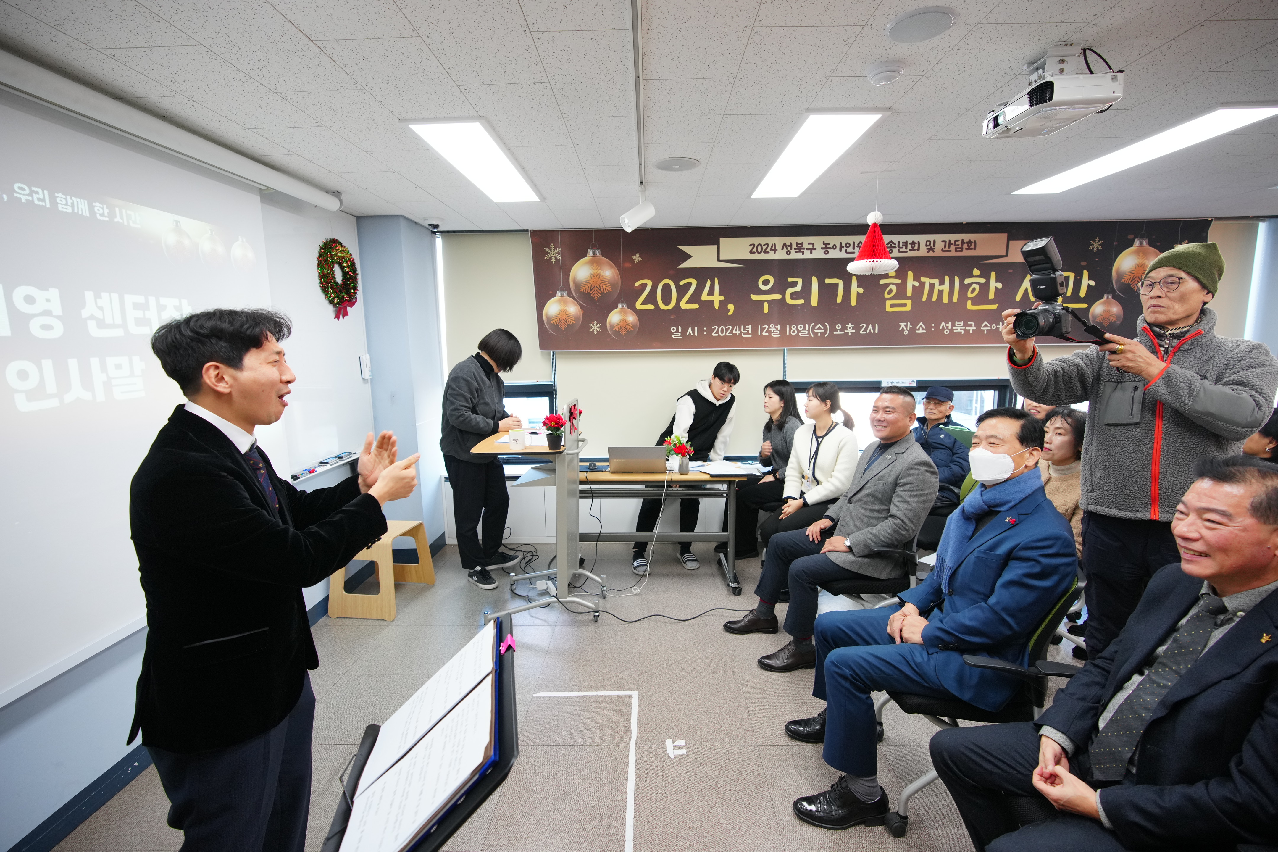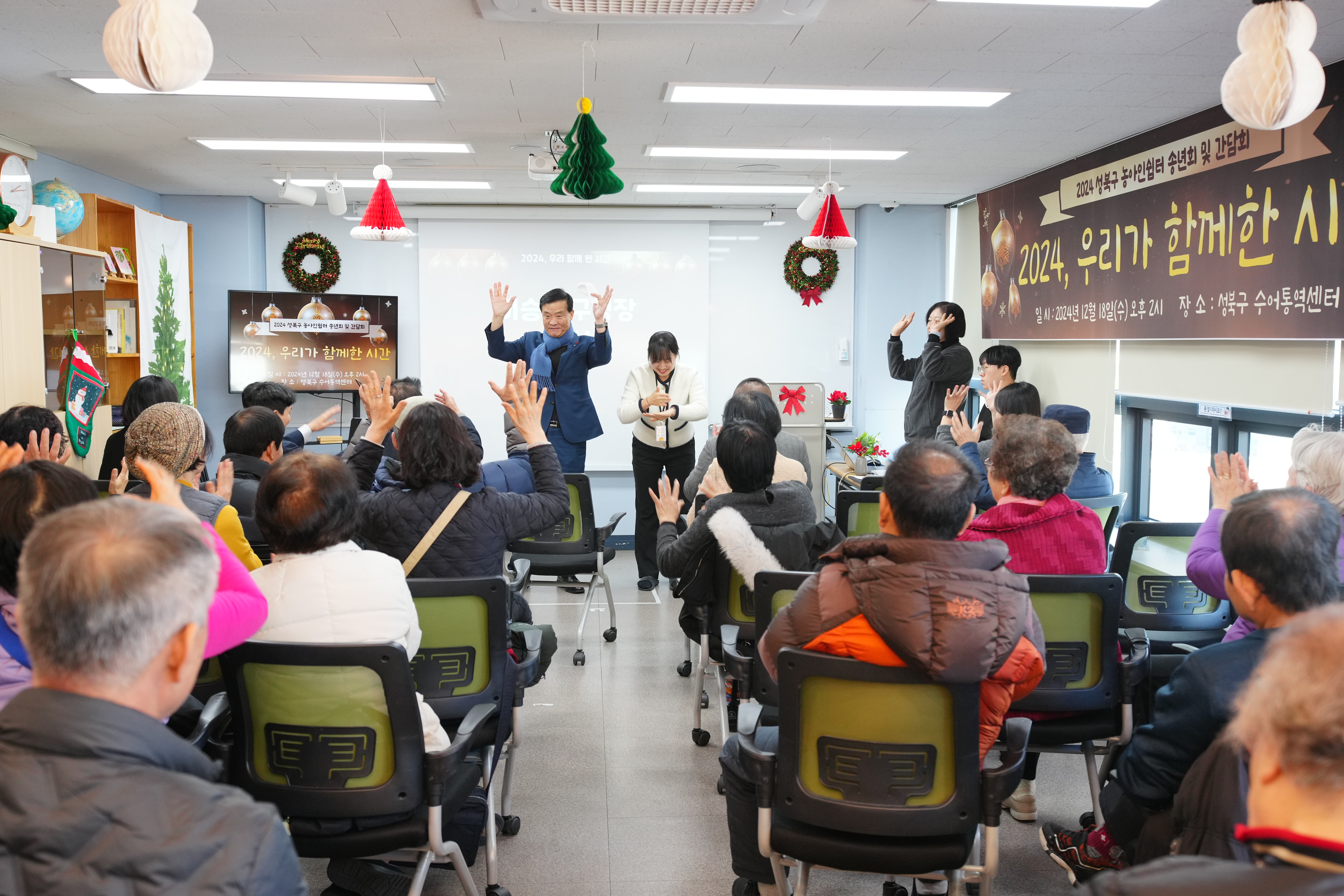 포토, 현장속으로 홈 구청장은 지금 이승로입니다 공약&매니페스토 참여와 소통 구청장은 지금 현장 구청장실 포토, 현장속으로 포토, 현장속으로 영상으로 보는 구정활동 언론이 보는 구정활동 공유하기 블로그 페이스북 닫기 인쇄 복사 성북구 농아인쉼터 송년회 및 간담회 {게시글 제목} - 사진번호, 촬영일, 촬영자, 촬영장소, 출처, 분류, 설명 정보 제공 사진번호 20636 촬영일 2024-12-18 촬영자 홍정모 촬영장소 성북구수어통역센터 출처 홍보전산과 분류 ▶복지교육국>어르신·장애인복지과 설명 성북구 농아인쉼터 송년회 및 간담회 이전으로 다음으로 목록보기 다운로드 이전 다음 닫기 다운로드