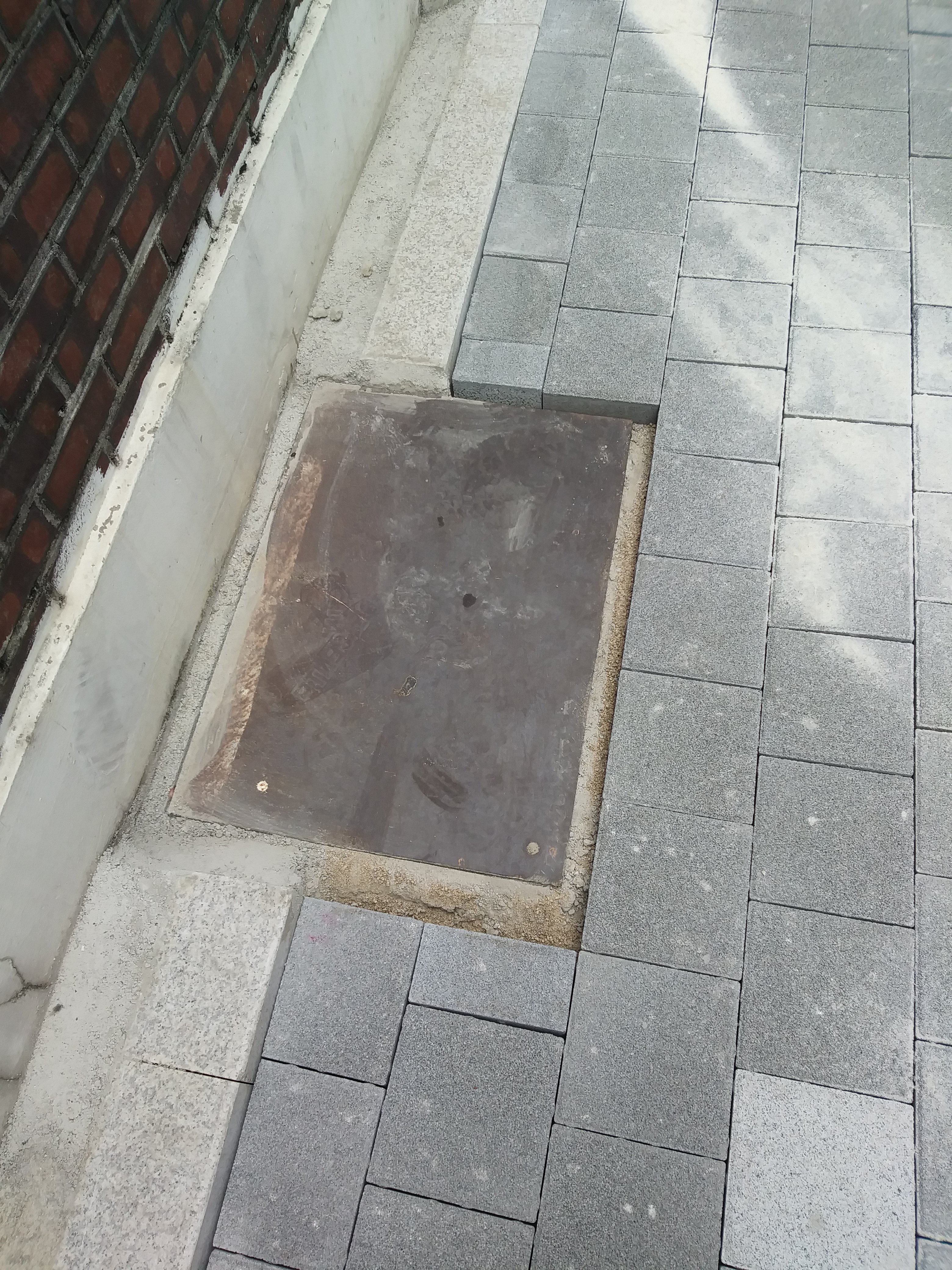 우선 하수시설 테두리는 공사도중 제거한 것이니, 테두리를 다시 만들어 주세요. 보도블럭과 테두리 사이도 메꿔주세요.