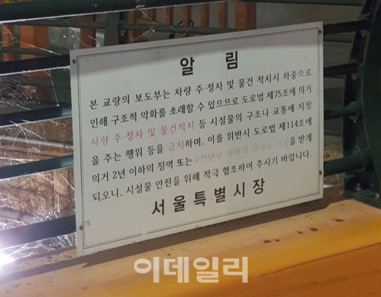 또한 주말에는 더욱더 교량 위 주차가 빈번히 발생되므로 주말에도 지속적인 단속 및 첨부사진과 같은 경고문 부착이 필히 필요하오니