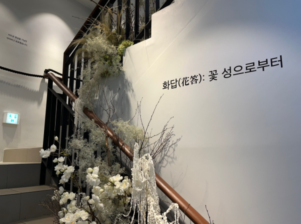 ▲1층에서 3층으로 오르는 계단 구간은 봄으로 가는 길목처럼 꽃과 나무로 꾸몄다.