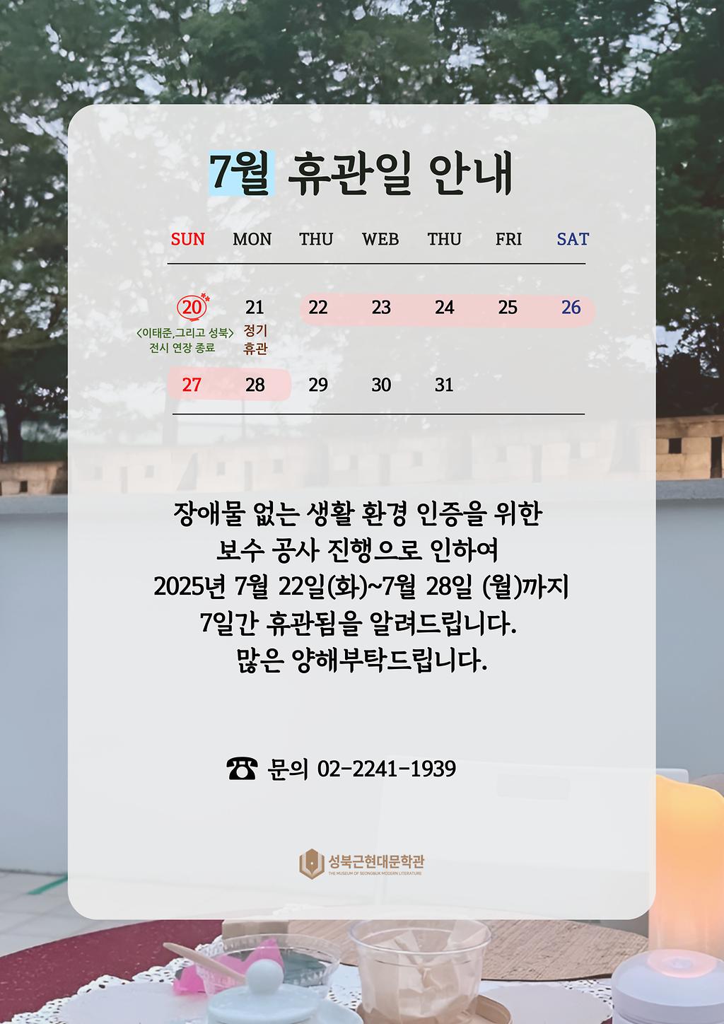 「성북근현대문학관」 7월 임시 휴관 안내(7/22~7/28)