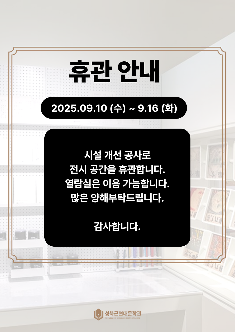 [긴급] 성북근현대문학관 전시 공간 임시 휴관 안내 (9/10~9/16)