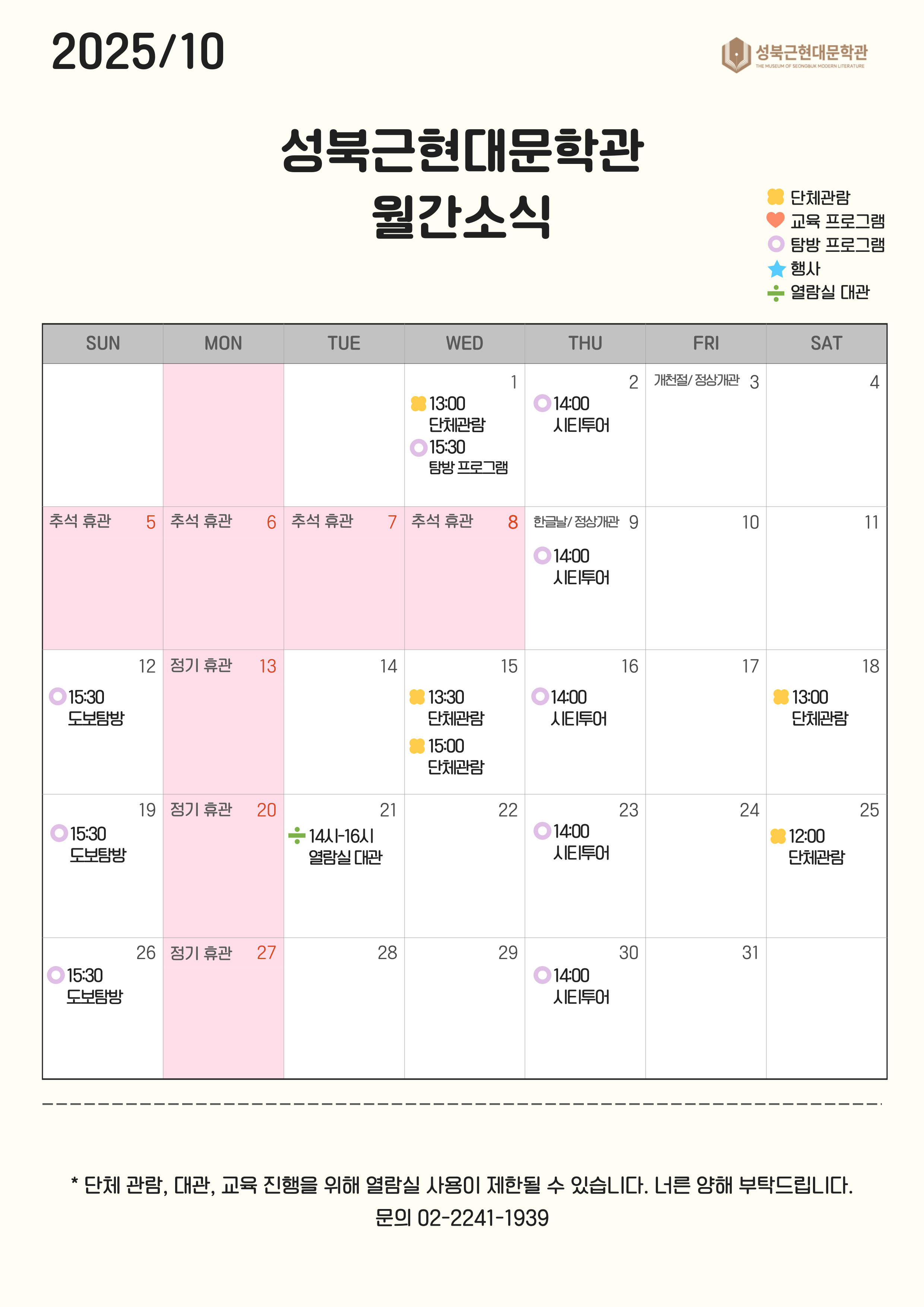 「성북근현대문학관」 10월 추석연휴 휴관 안내 (10/05~10/08)