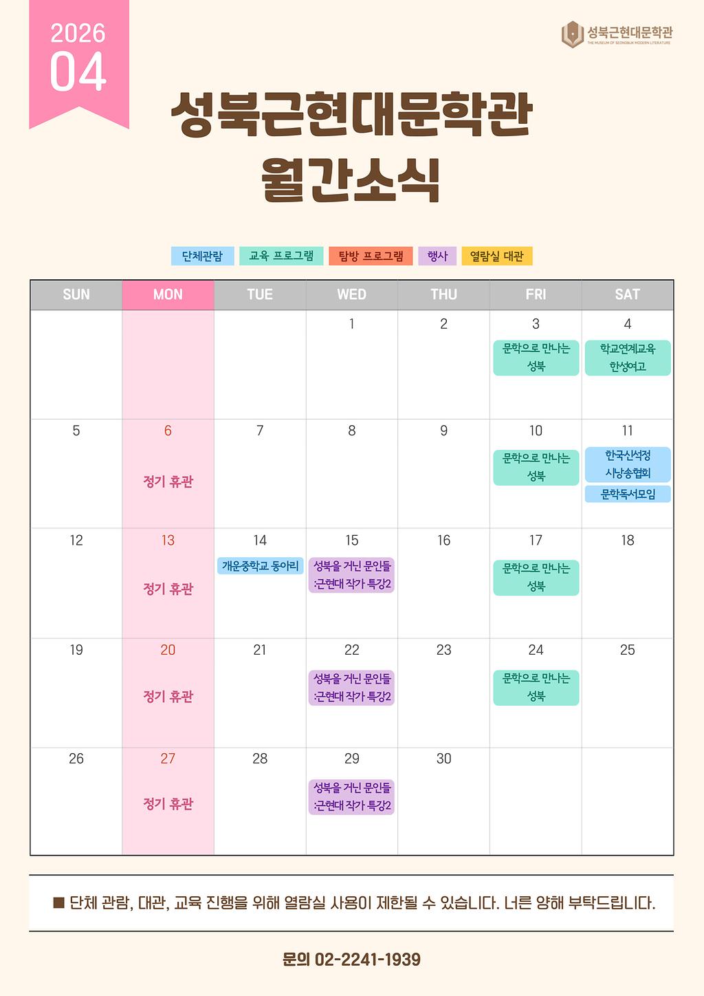 「성북근현대문학관」 4월 일정