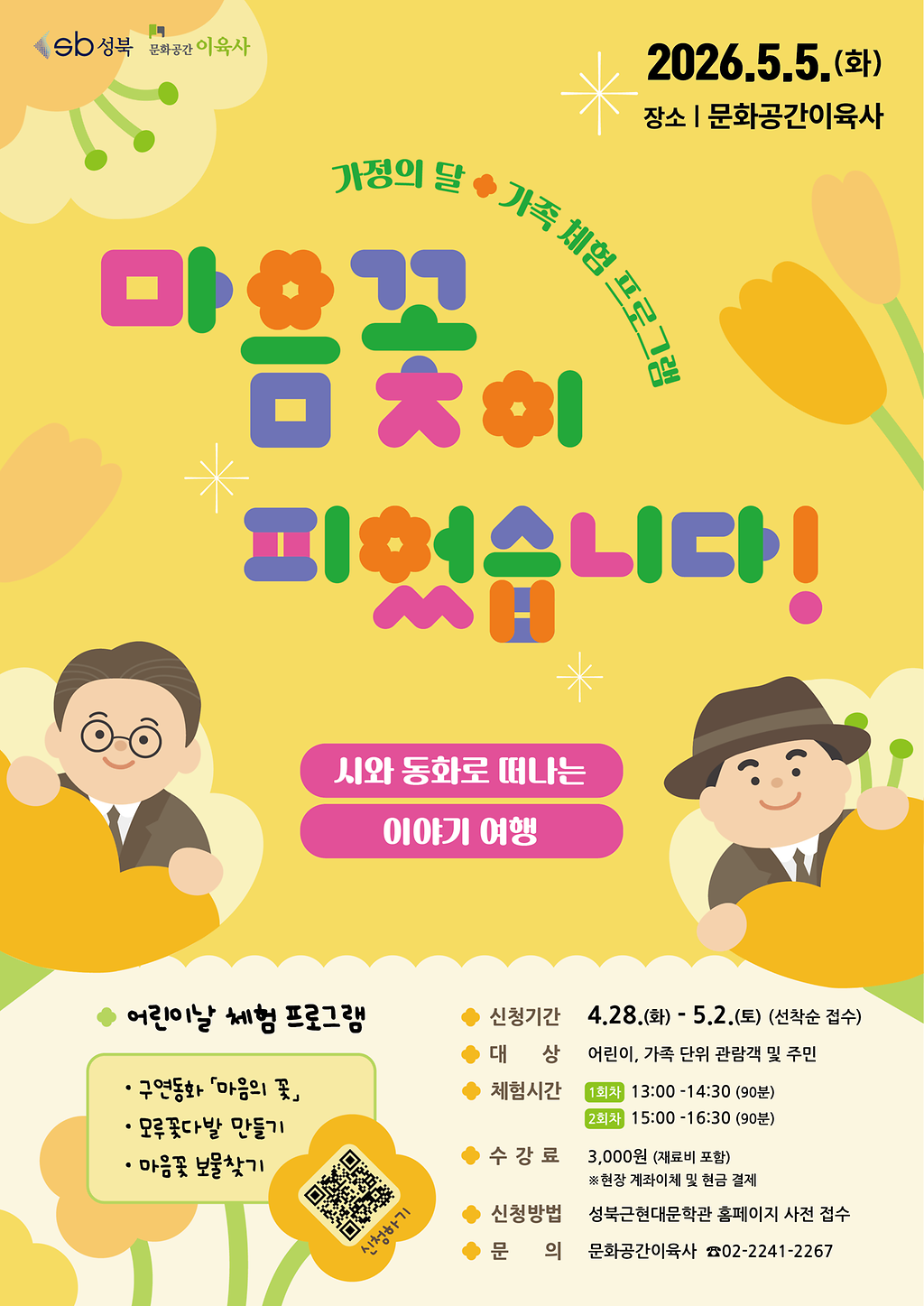 (1) 본 게시글은 문화공간이육사에서 진행되는 <마음꽃이 피었습니다! : 시와 동화로 떠나는 이야기 여행> 체험 신청 페이지입니다.