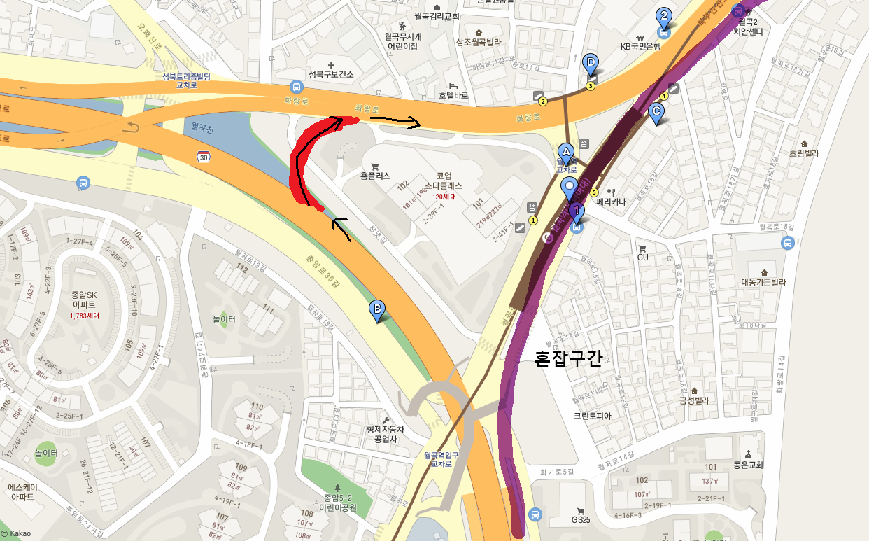 내부순환로 -> 북부간선도로 연결 - 월곡역 홈플러스 서편에 내부순환로와 북부간선도로를 연결하는 공사 진행 - 내부순환로 마장->길음 방향 1개 차로를 북부간선도로 진입로로 활용 - 내부순환로 길음->북부간선로 방향 1개 차로를 차단하고, 내부순환로 마장->북부간선도로 진입로로 전용 |