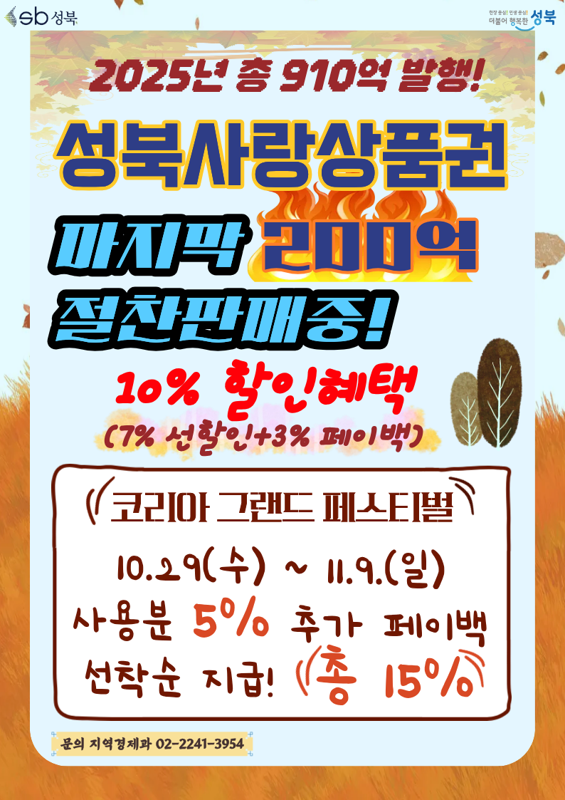 '코리아 그랜드 페스티벌' 맞이 10.29(수)부터 11.9.(일)까지 총 12일간 성북사랑상품권 사용분에 대해 5% 추가 페이백을 지급해드립니다! 기존 10% 할인혜택 (7% 선할인 + 3% 페이백)에 이번 5% 추가 페이백 으로 총 15%의 할인혜택을 누려보세요~ 추가 페이백은 선착순이며 예산 소진시 종료 되오니 주민 여러분들의 많은 참여 바랍니다~