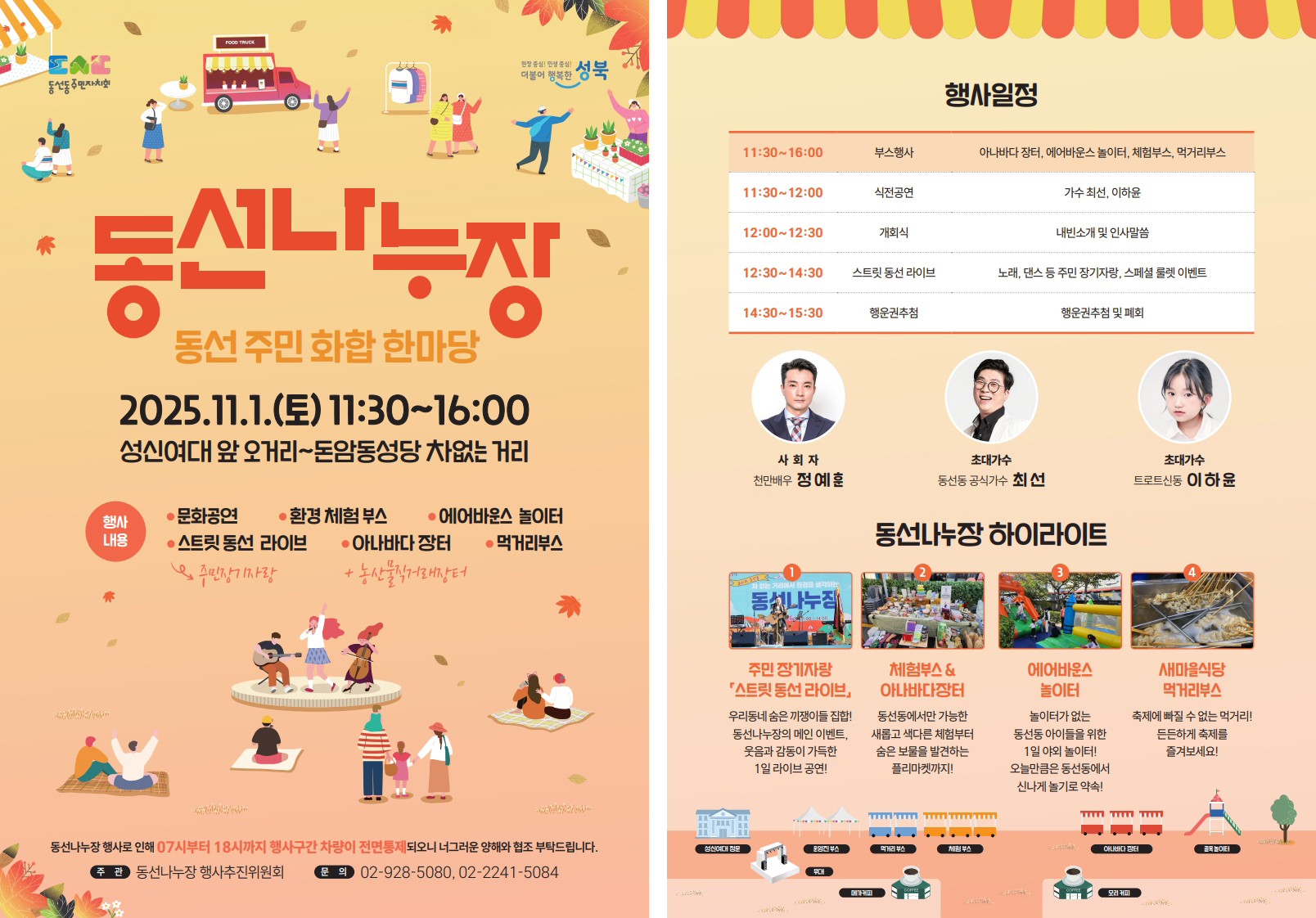 □ 일 시 : 2025. 11. 1.(토) 11:30~16:00 ※ 개회식 12:00 □ 장 소 : 성신여대 앞 오거리 ~ 돈암동성당 일방통행길 □ 내 용 : 문화공연, 주민장기자랑, 아나바다장터, 체험부스, 에어바운스 놀이터, 먹거리부스 □ 주 최 : 동선동행사추진위원회 □ 문 의 : ☎02-928-5080, 02-2241-5084 |