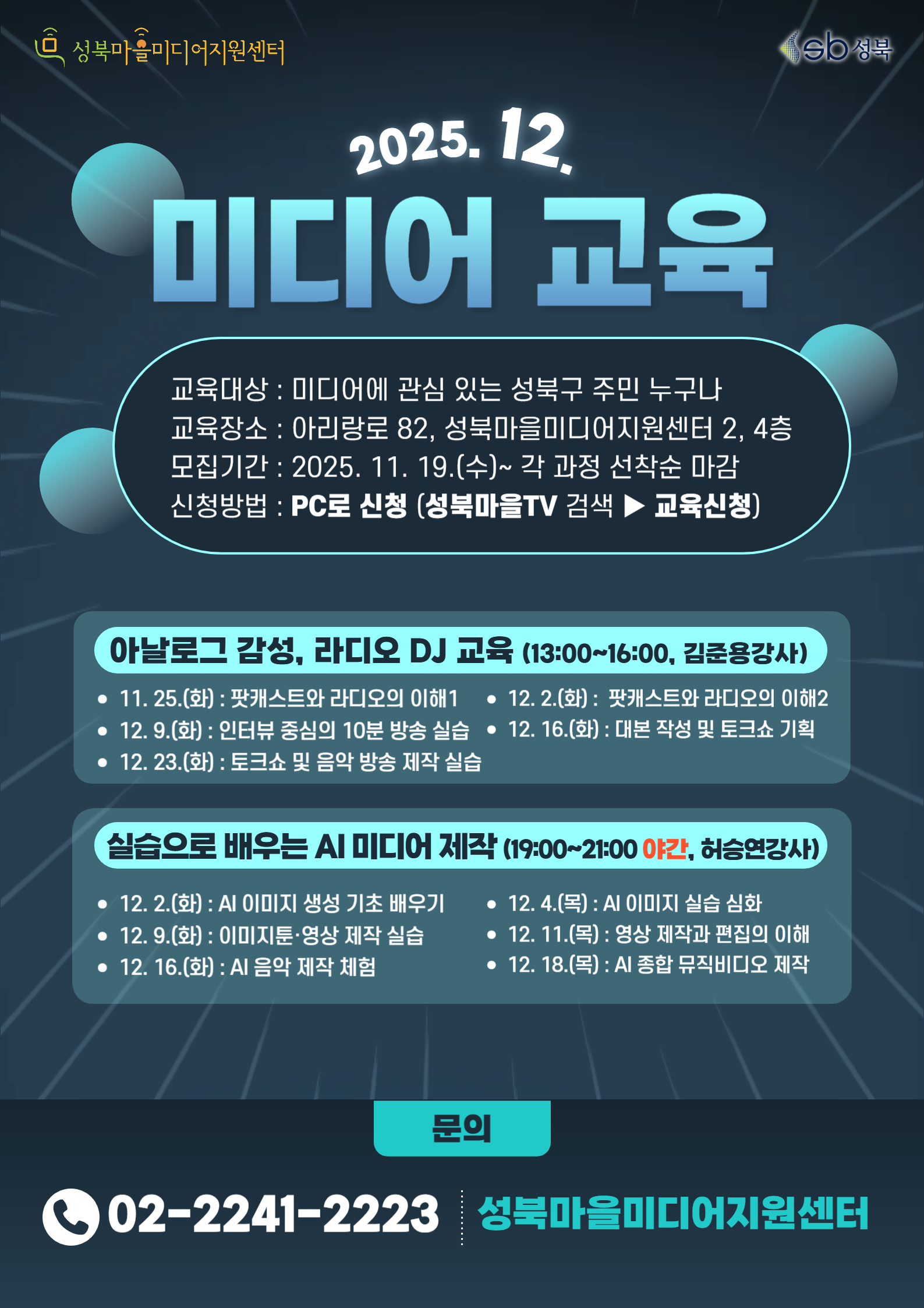 □ 교육명 : 쉽고 재미있는 미디어 교육 (12월) 「실습으로 배우는 AI 미디어 제작」 (3회차, 회차별 2시간, 야간) 허승연 강사 □ 신청방법 : 성북마을TV 홈페이지(https://sbtv.kr) 접속 후 교육신청