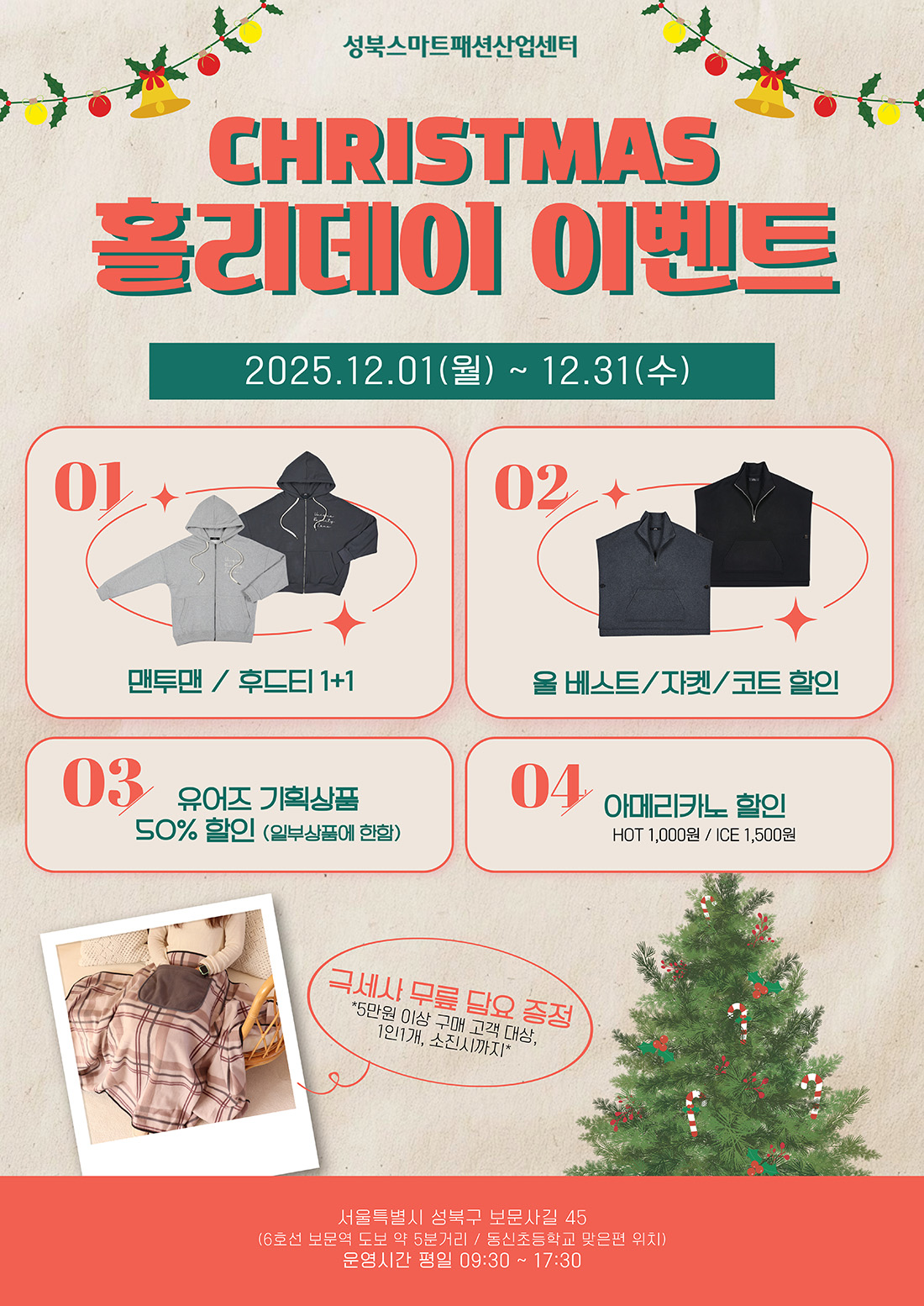 다양한 할인 행사와 사은품 증정행사를 진행합니다. (1) 이벤트 기간 : 2025년 12월 1일 ~ 12월 31일 (2) 이벤트 내용 : 1+1 맨투맨/후드티 울베스트/자켓/코트 할인 유어즈 기획상품 50%할인(일부상품에 한함) 아메리카노 할인 사은품 증정 (구매 고객 대상 무릎담요 증정) (3) 문의 : 성북스마트패션산업센터(02-927-9351) |